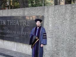 Me, in pre-ceremony regalia. The hood that I'm carrying in the picture will be placed on me by my thesis advisor during the ceremony. The blue-and-gold gown carries the colours of the University of California. The royal blue velvet on the gown and hood indicates the PhD degree. Most of the candidates at the ceremony have the plainer, generic black robes, rather than the UC-specific blue-and-gold (this makes me easier to spot in the following pictures). The PhD tam (hat) is also royal blue velvet, with a gold tassel (the side you wear the tassel on is not relevant for a PhD; the hood is the "has been conferred" indicator).