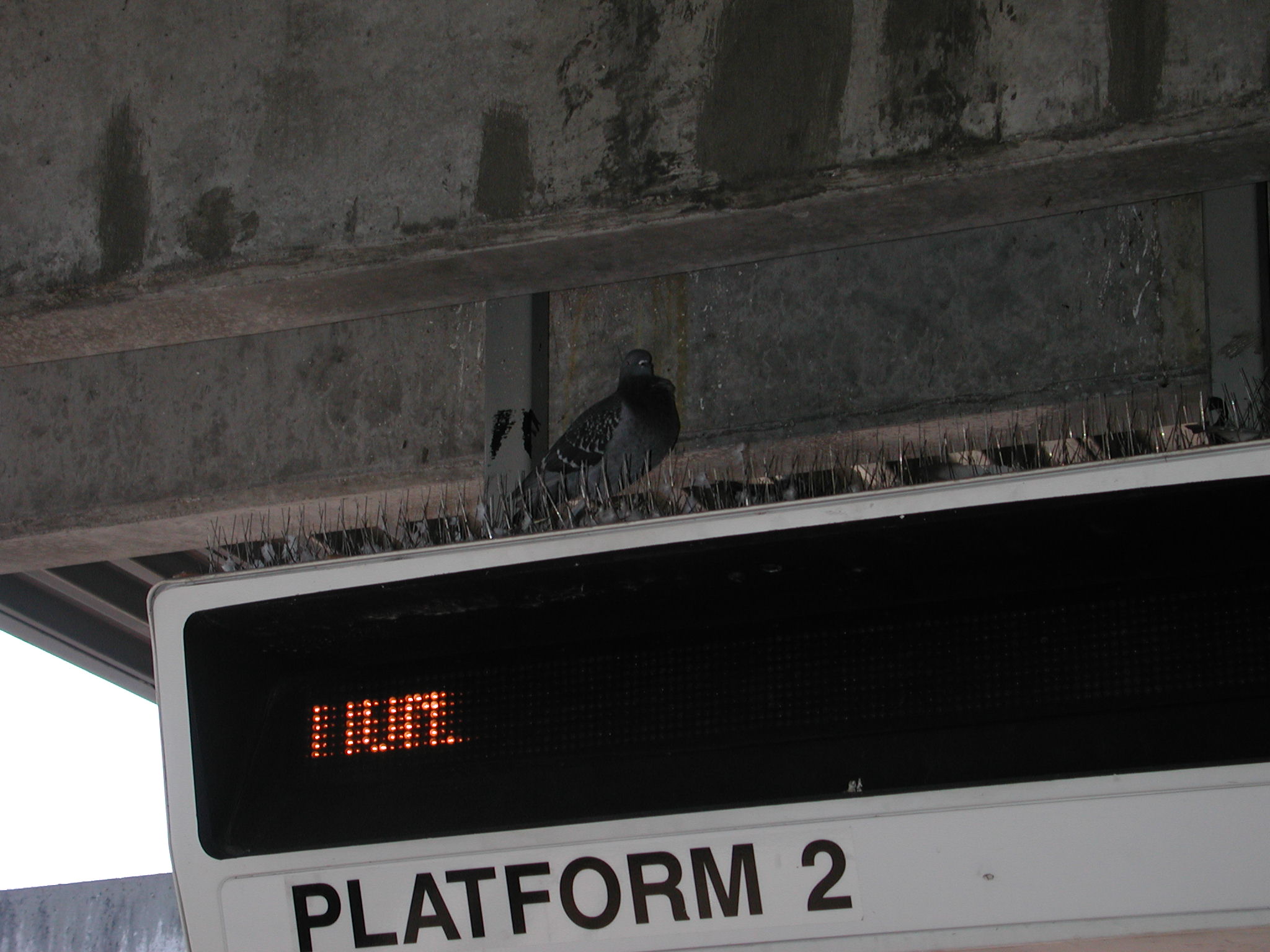 This pigeon somehow manages to evade the anti-pigeon spikes on the top of this BART display.