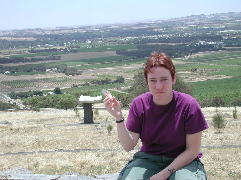 The wine tour stopped at a pretty outlook. Kat holds Corqy.