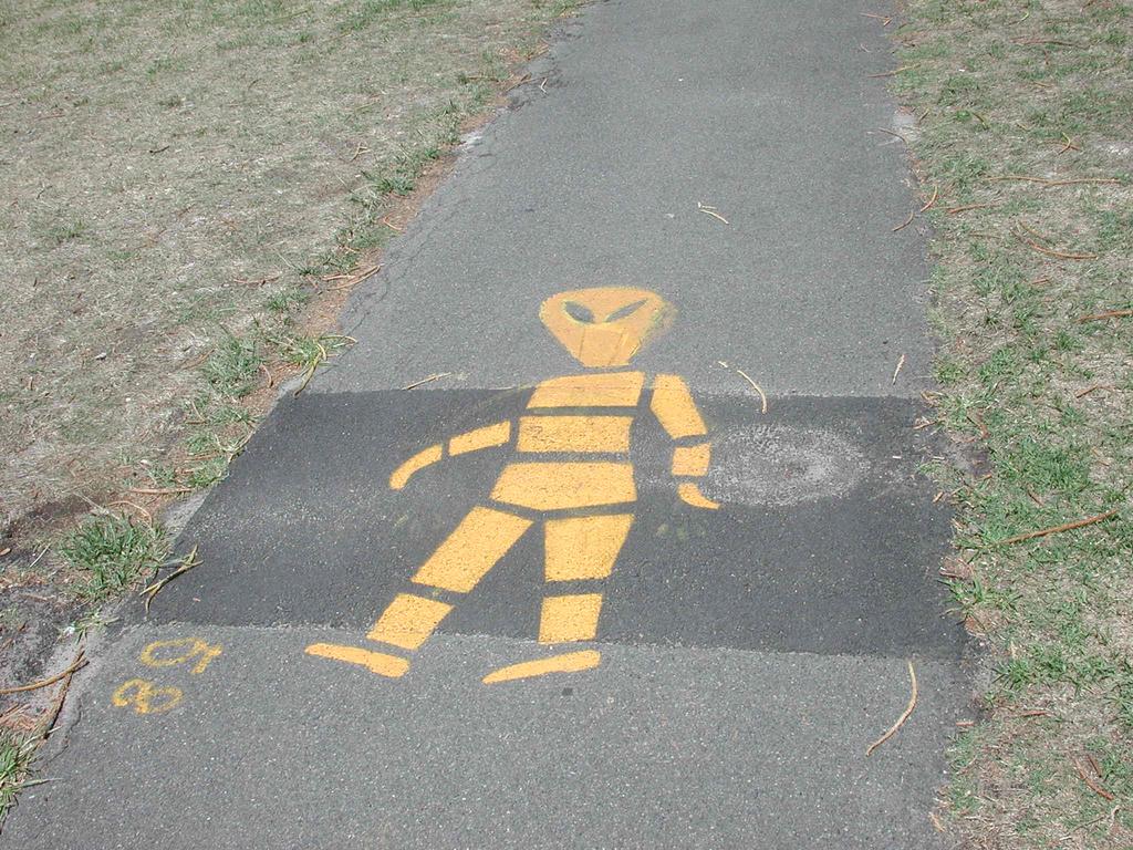 A pedestrian walk sign's head has been subtly altered...