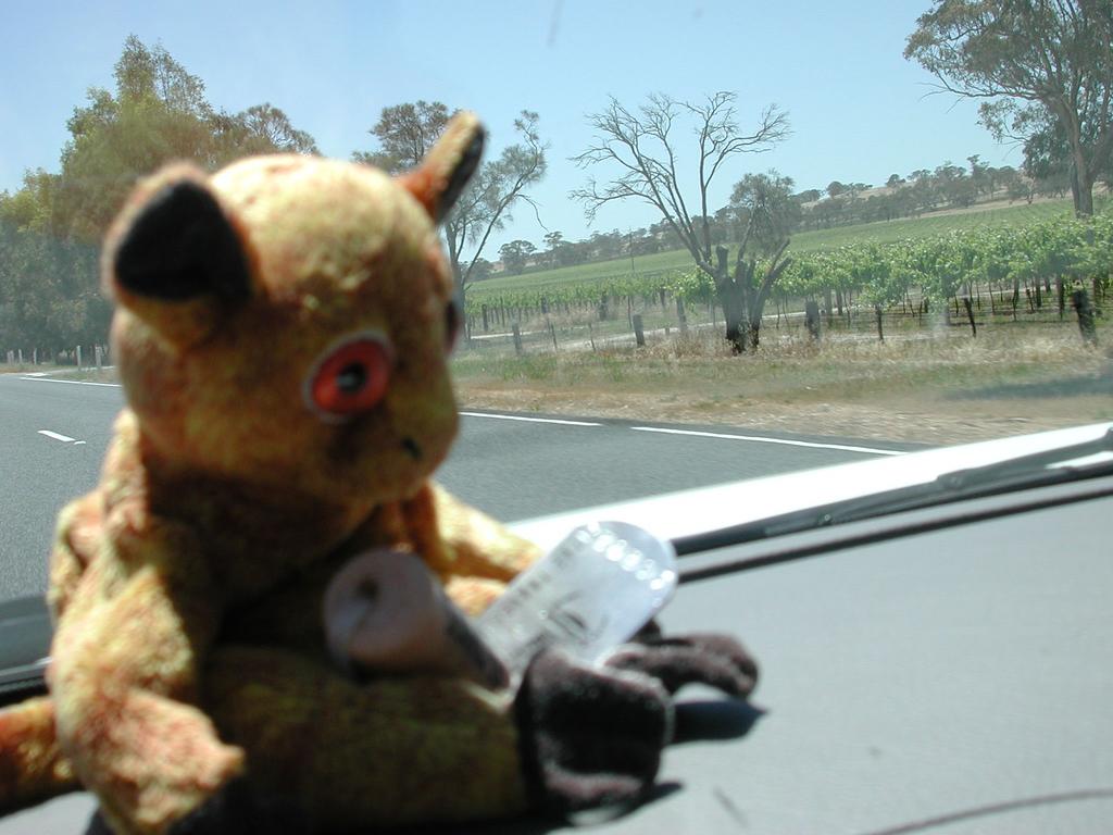 Gizmo and Corqy drive through the Coonawarra wine region.