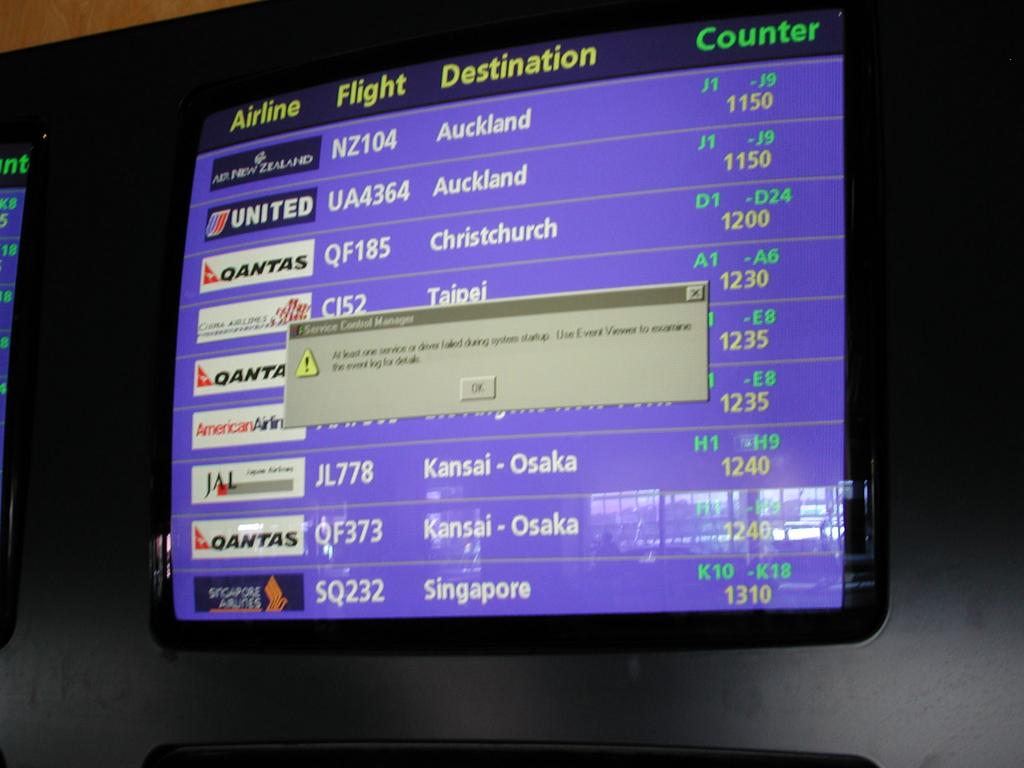 On the way out of Sydney, one of the airport flight information monitors was displaying a Windows error message.
