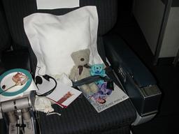 Henry (with the plaid bow) got his own first-class seat both ways across the Pacific. On the way back, the flight staff were really taken with him, so much so that they gave him a new friend: the little blue bear named Anzed. (After that, of course, Henry shared his seat with Anzed.)
