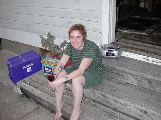 Kat enjoys a glass of wine on the front steps, listening to Car Talk on the radio. In New Orleans, you're allowed to drink alcohol outside, though you're not allowed to have glass bottles in the French Quarter.