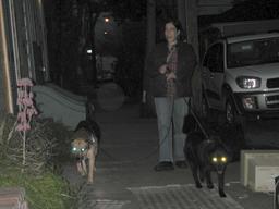 Ben's girlfriend Marcy, walking her dogs Calliope and Argus (though in this picture, they look quite like hellhounds).