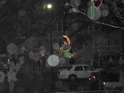 Proteus in the rain. Many people were wearing rain slicks. The parades largely consist of people on large floats throwing beads and other things at spectators. Since it was raining, there were fewer spectators, so maybe we got more beads than usual. :-)
