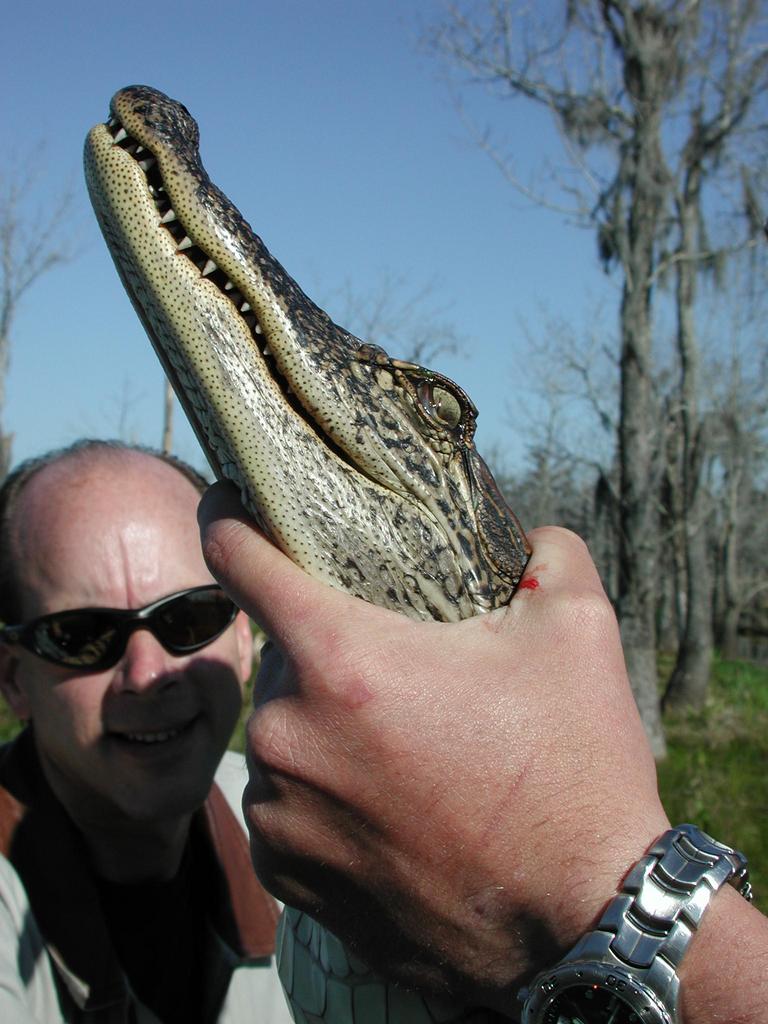 Note the blood on the guide's hand; the gator snapped at him when he took it out of the cooler.