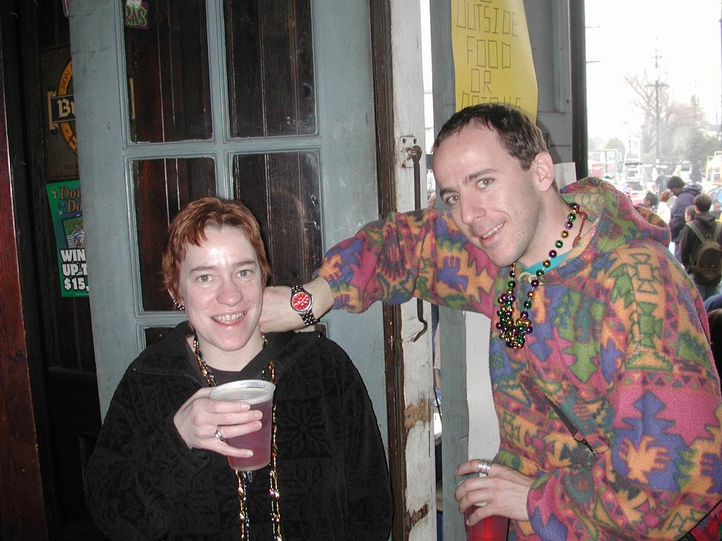 Kat and Ben start the beer-drinking. Ben is holding up his watch to indicate that it's 9:15 in the morning.