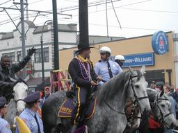 The Zulu parade begins with the Mayor of New Orleans on horseback.