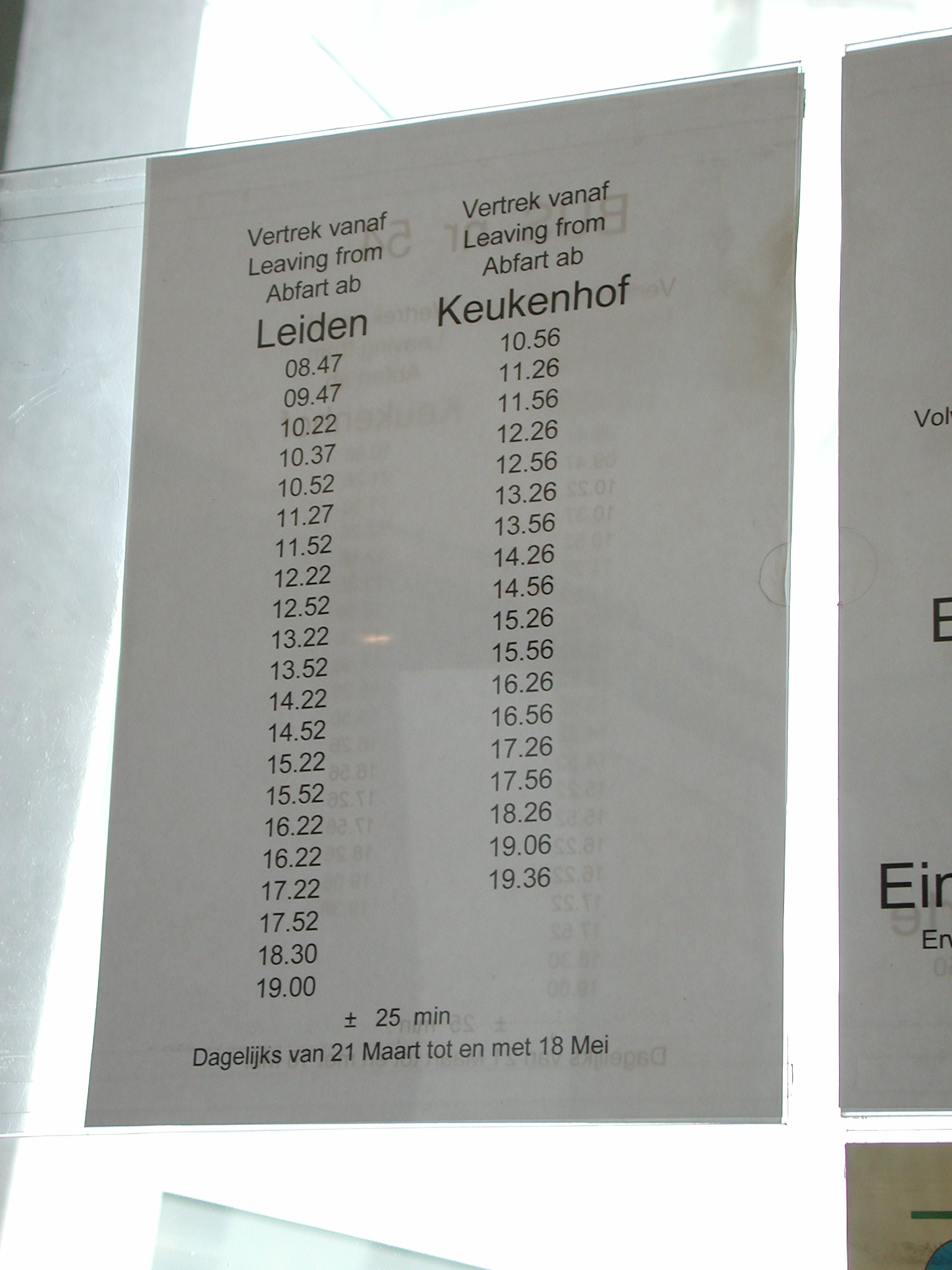 The bus schedule to and from Keukenhof. Note that there's a bus about every half-hour, but the error in the listed times is given as plus or minus 25 minutes. Hmmm.