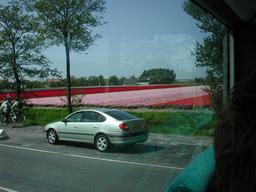 On the way to Keukenhof, we pass fields of stripes of coloured tulips.