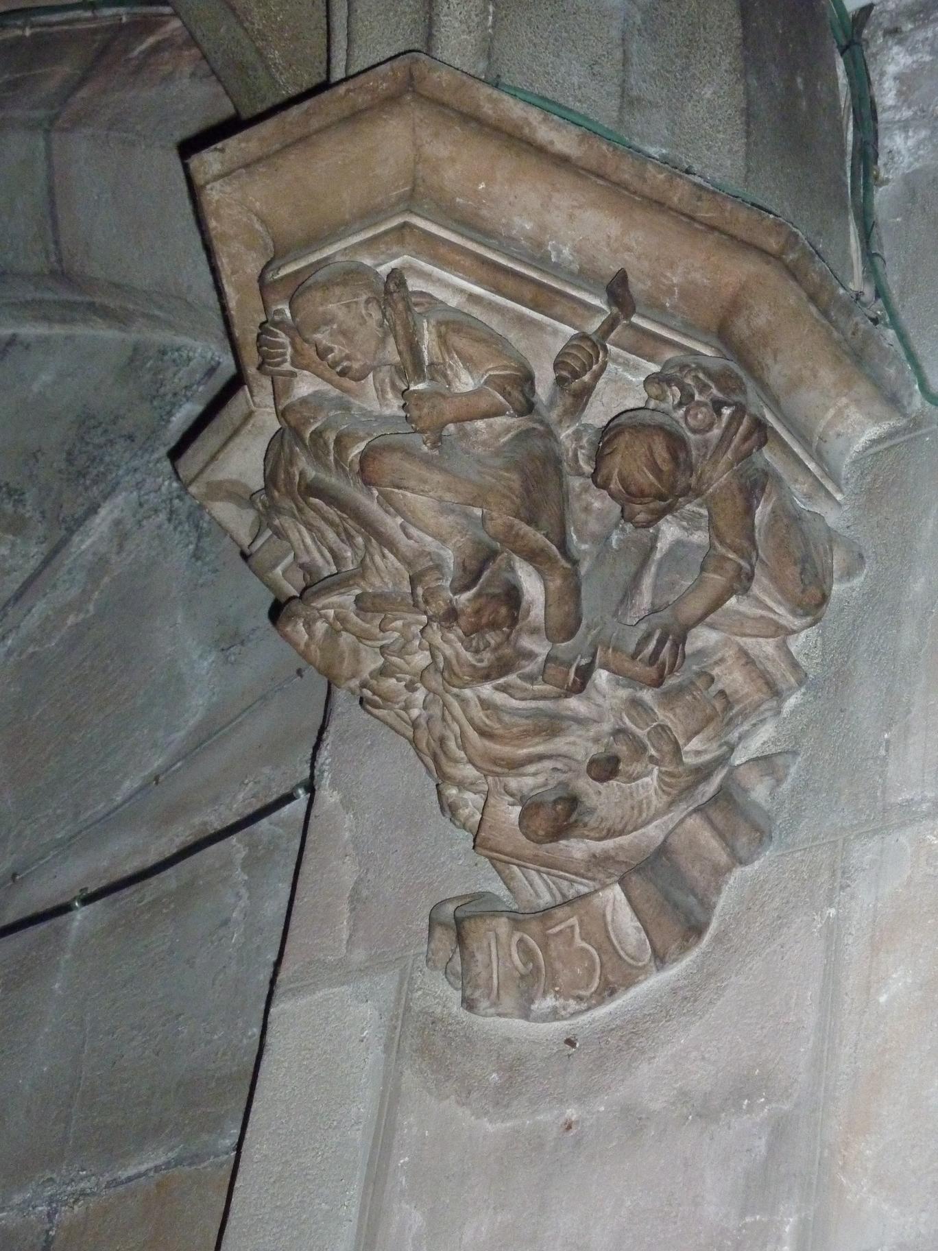 Memorial carving in a church, symbolizing the destruction of the church in 1936