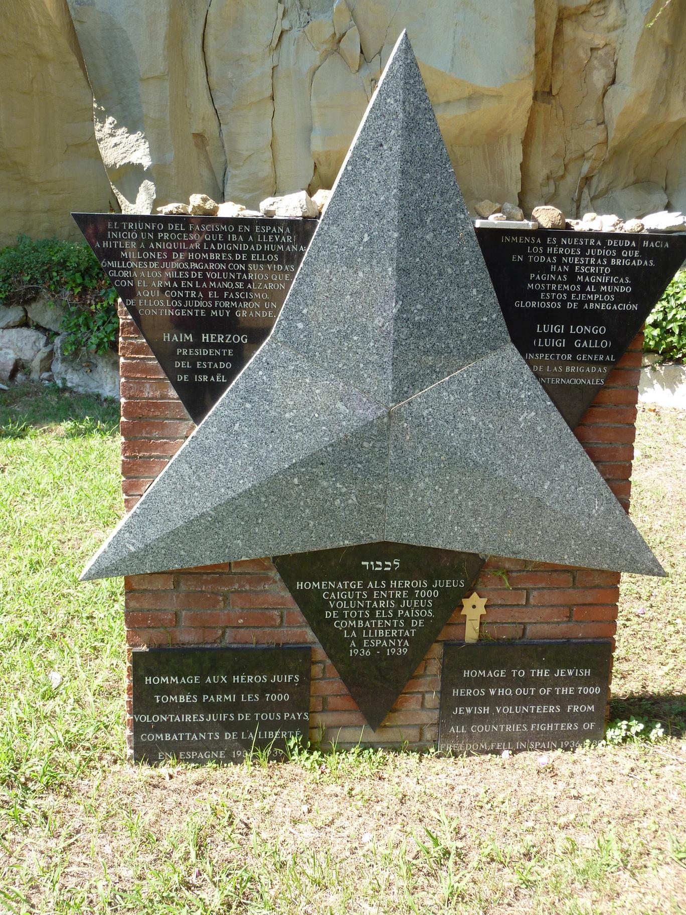 "Homage to the Jewish heros who, out of the 7000 Jewish volunteers from all countries, fighters of freedon, fell in Spain 1936–1939"