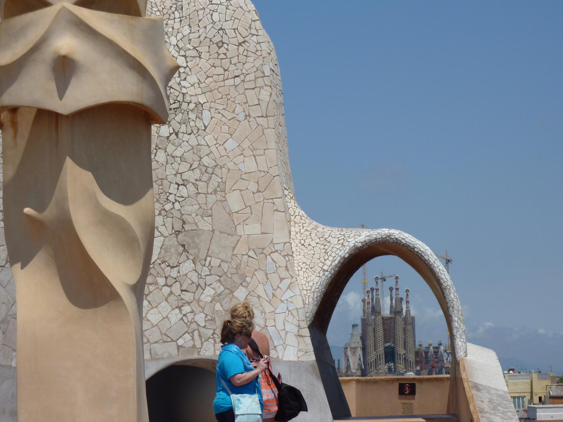 A view of La Sagrada Familia through an arch on the roof of La Padrera.