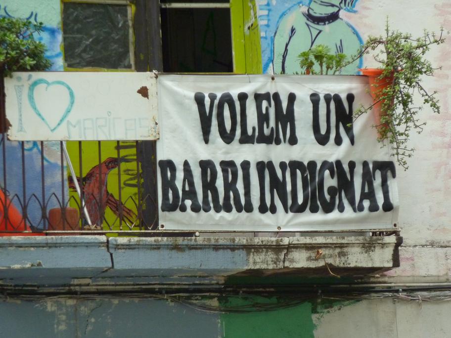 "We want an outraged ("indignat") neighbourhood". A play on a similar banner, "We want a decent ("digne") neighbourhood".