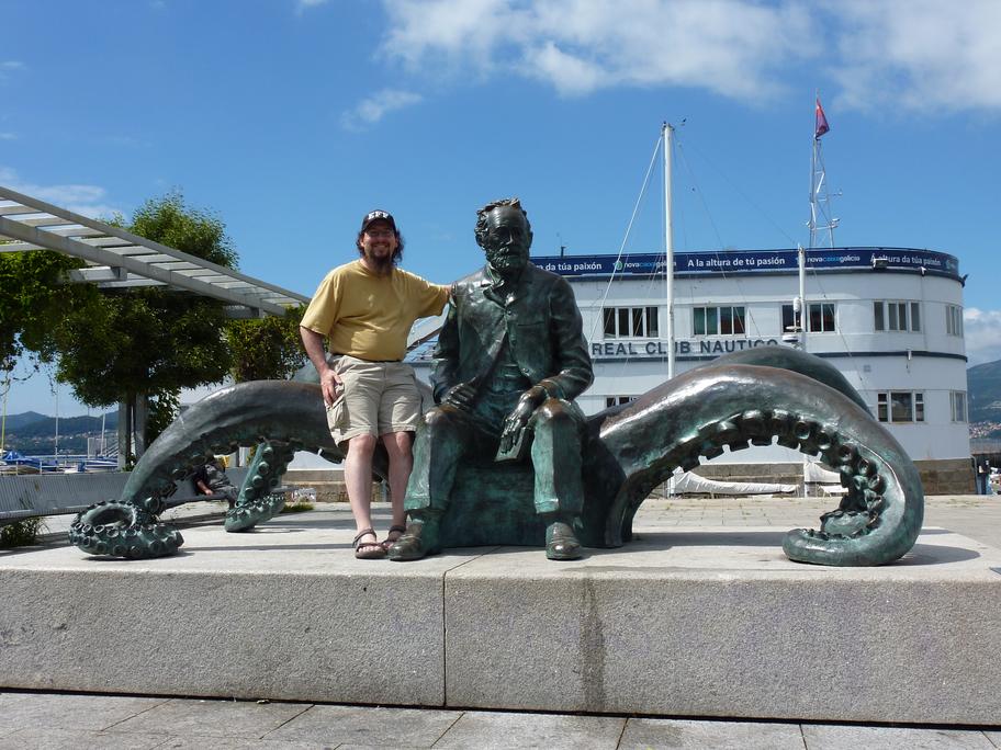 Ian sits with a statue of Jules-Verne-as-octopus. Verne mentioned Vigo in 20,000 Leagues Under the Sea.