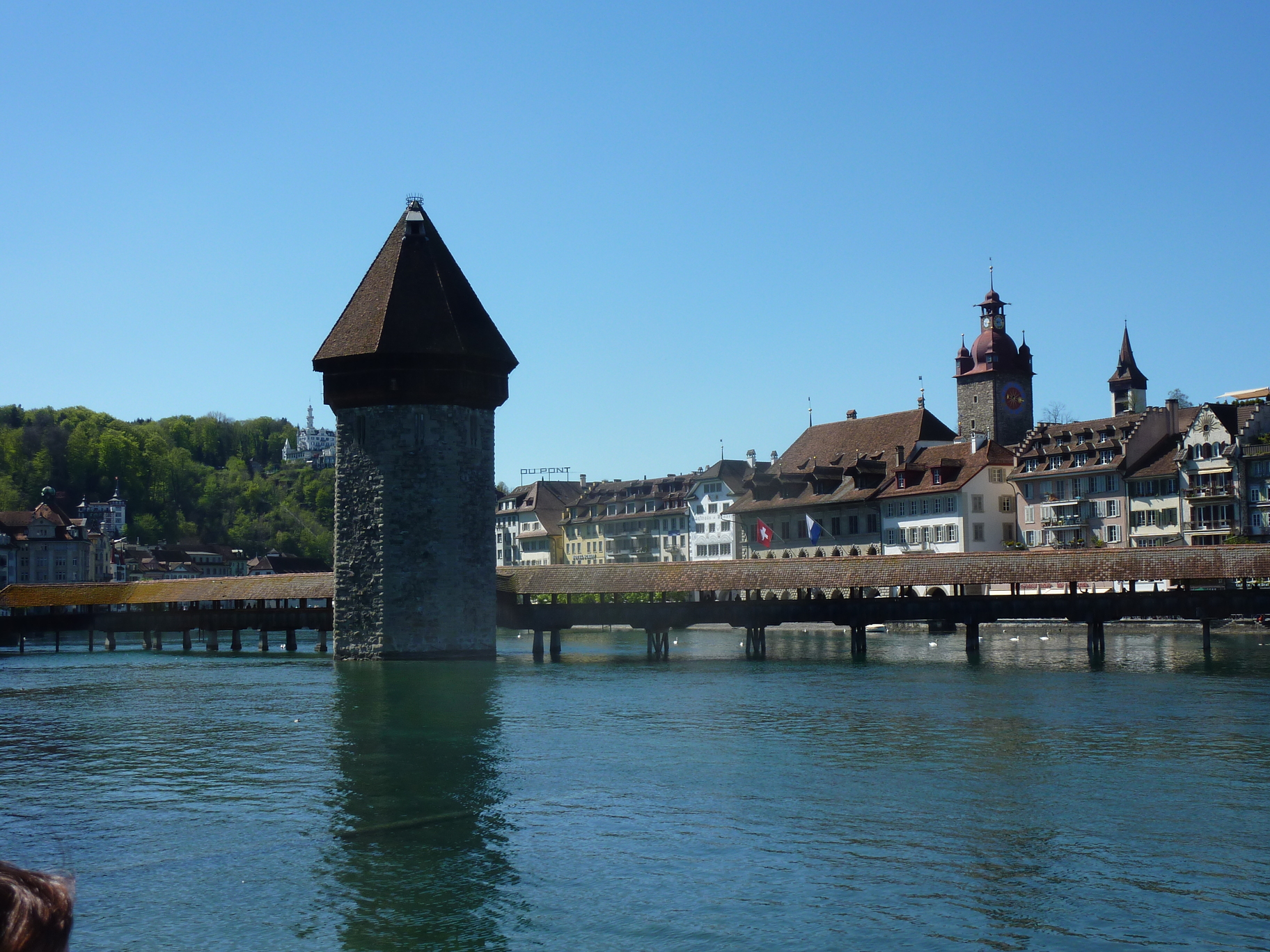One of our stops was in Lucerne; we took a one-hour break from the trains to walk around. This is the Kapellbrücke (Chapel Bridge). Kat bought a Swiss Army knife from the store in the tower (the former armory).