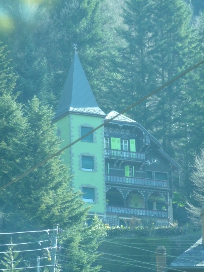 A pretty green chateau up on the mountainside.