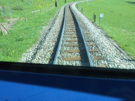 Looking down and just a tiny bit ahead, one can see the tracks disappearing under the train.