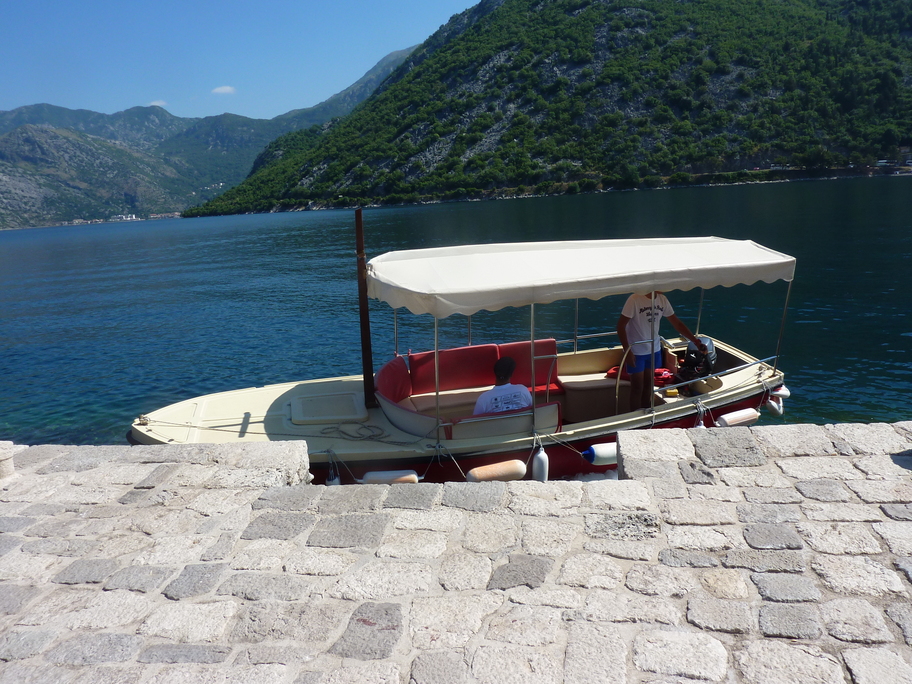 We drove around the bay to Perast, where we took this tiny boat to the "Our Lady of the Rock" artificial island. The island was constructed over the course of a century after fishermen found a painting of the Virgin Mary on a tiny outcropping of rock in 20–30 metres of water. After constructing an island for a century by dumping more rocks there (as well as captured ships laden with rocks), they spent another century constructing the church on the island.