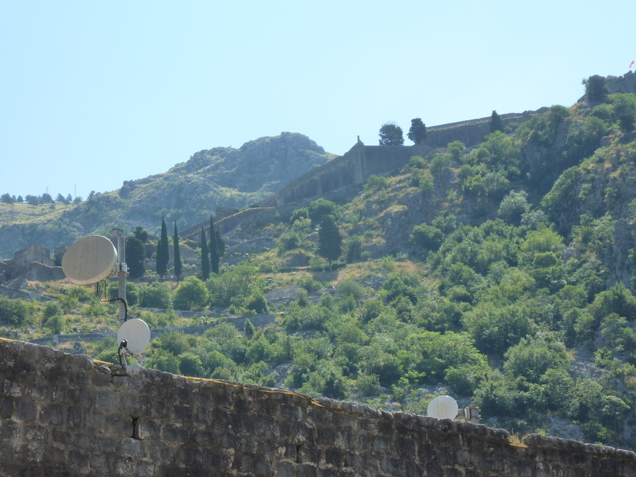 More around the bay to Kotor. The old city of Kotor is nestled between water and a very large mountain. It is surrounded by a large wall that goes a substantial way up the mountain.