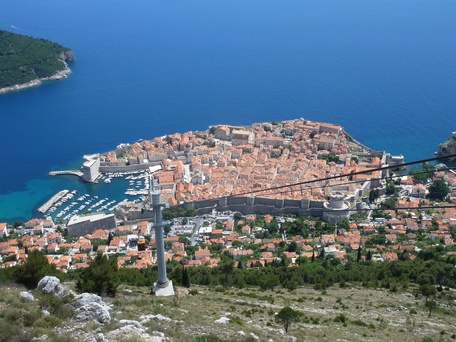 The old (walled) city of Dubrovbik, as seen from the mountain. You can see the cable car line as well.