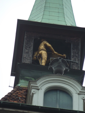 The bell ringer figure strikes the bell to chime the hour.
