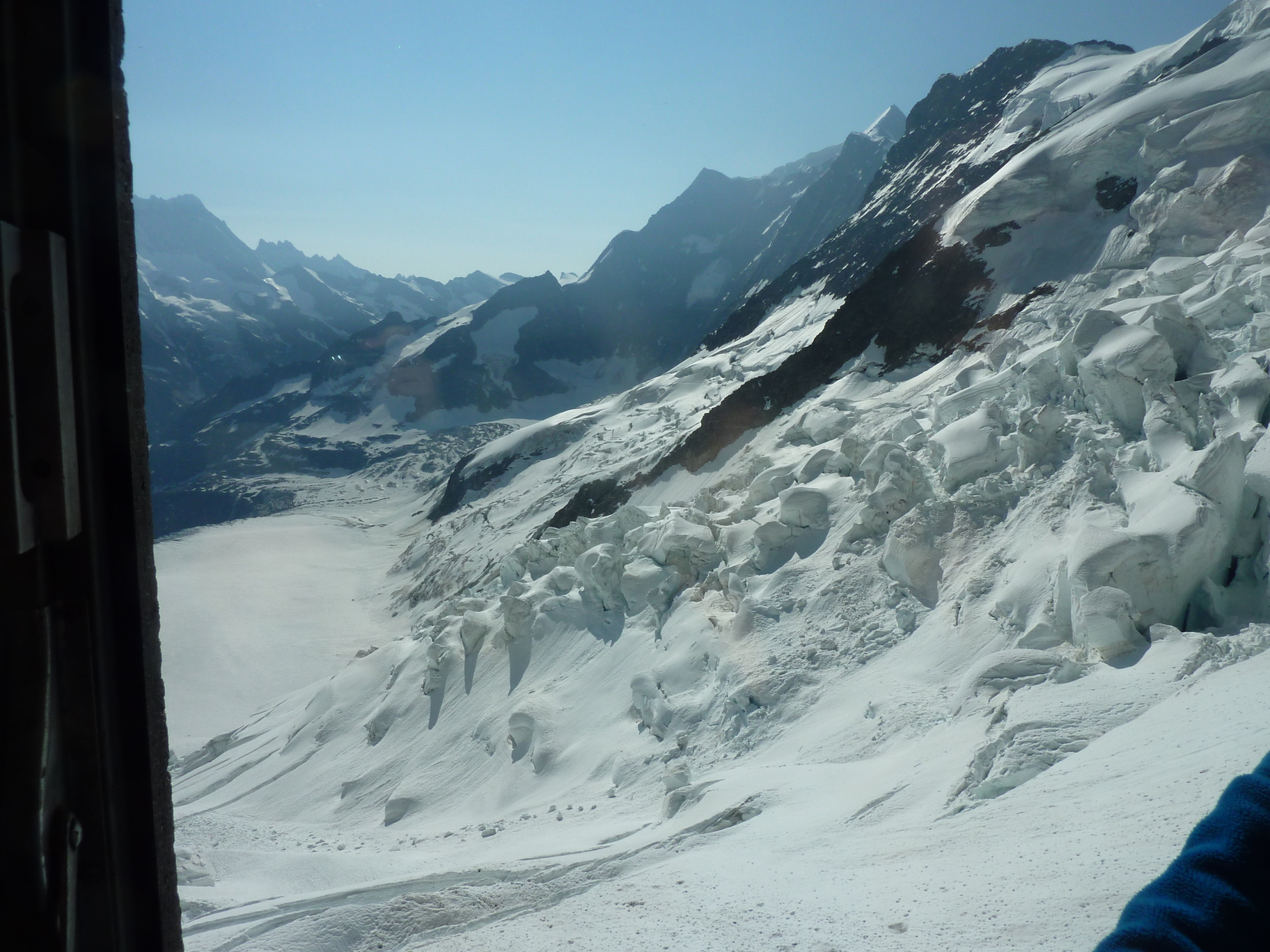 At the penultimate train stop, Eismeer Station, you can get out an take pictures for a few minutes. The station is underground, behind the south-east face of Eiger and has windows overlooking Ischmeer glacier.