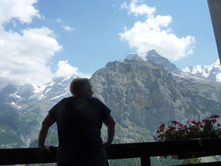 The view from our hotel balcony. We stayed at Hotel Eiger, which was splendid. Eiger, Mönch, and Jungfrau are known as "the big three". You can see Jungfrau to the right, behind the closer mountain. Eiger and Mönch's peaks, to the left, are obscured by clouds. We didn't get a good picture of all three, but there are plenty online.